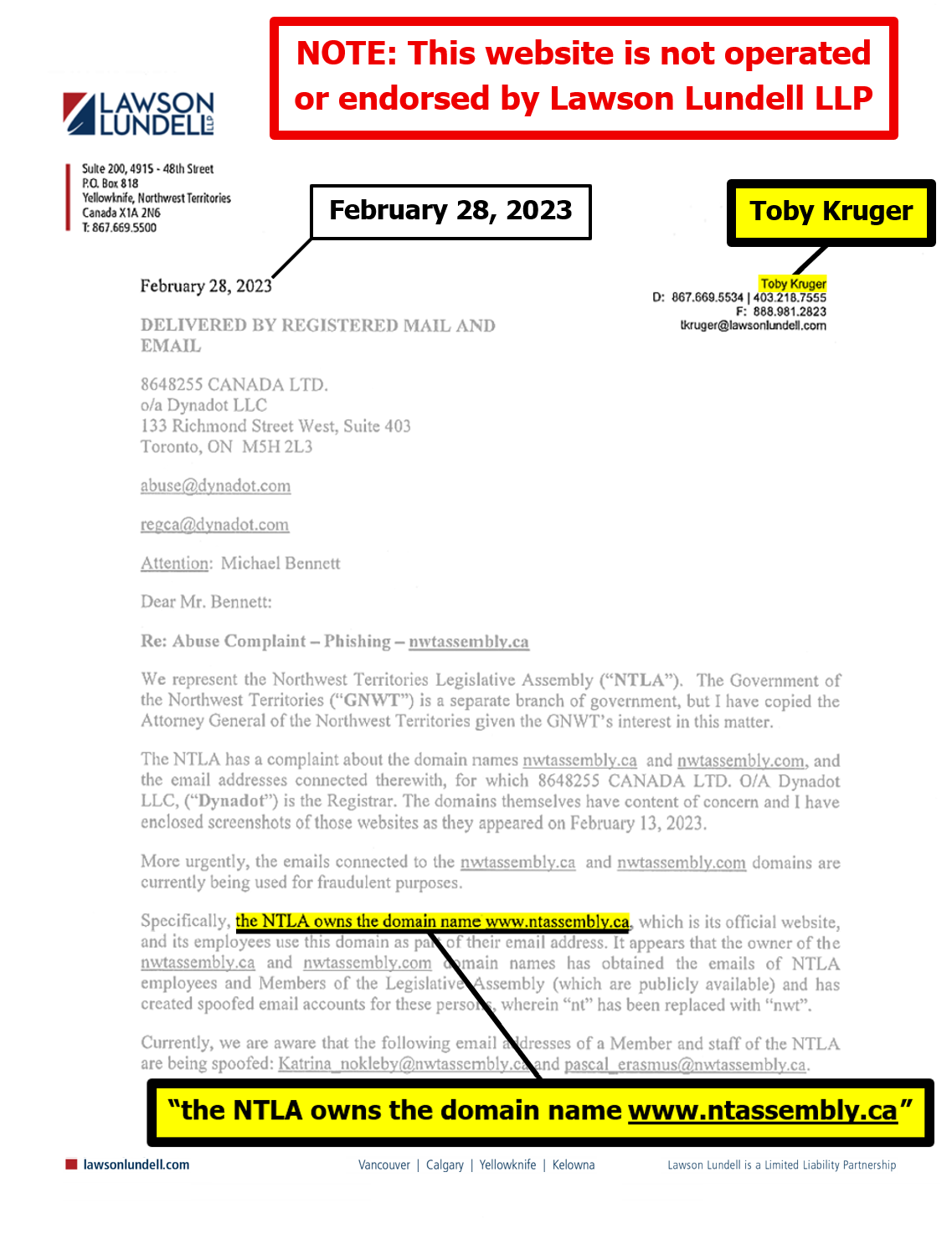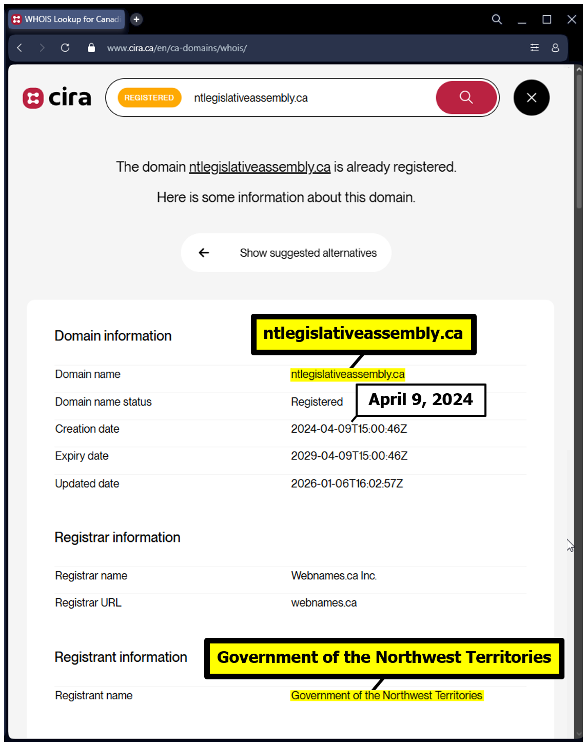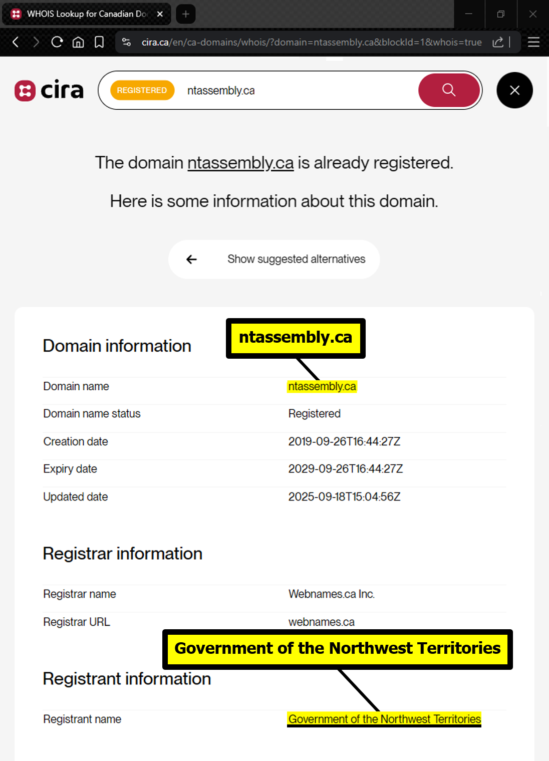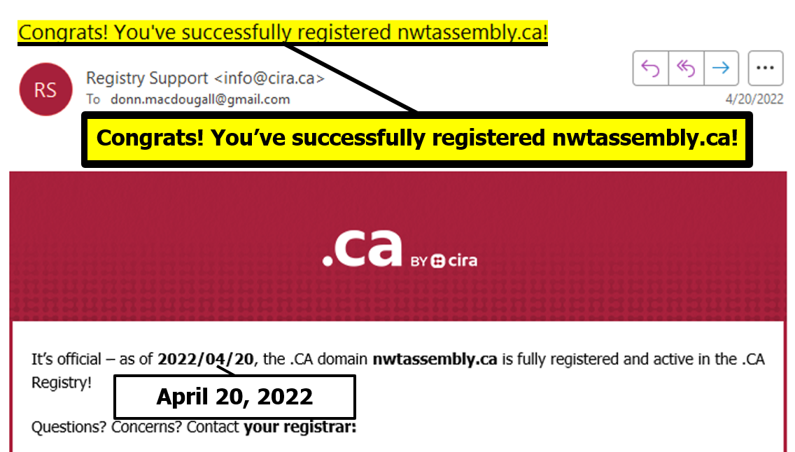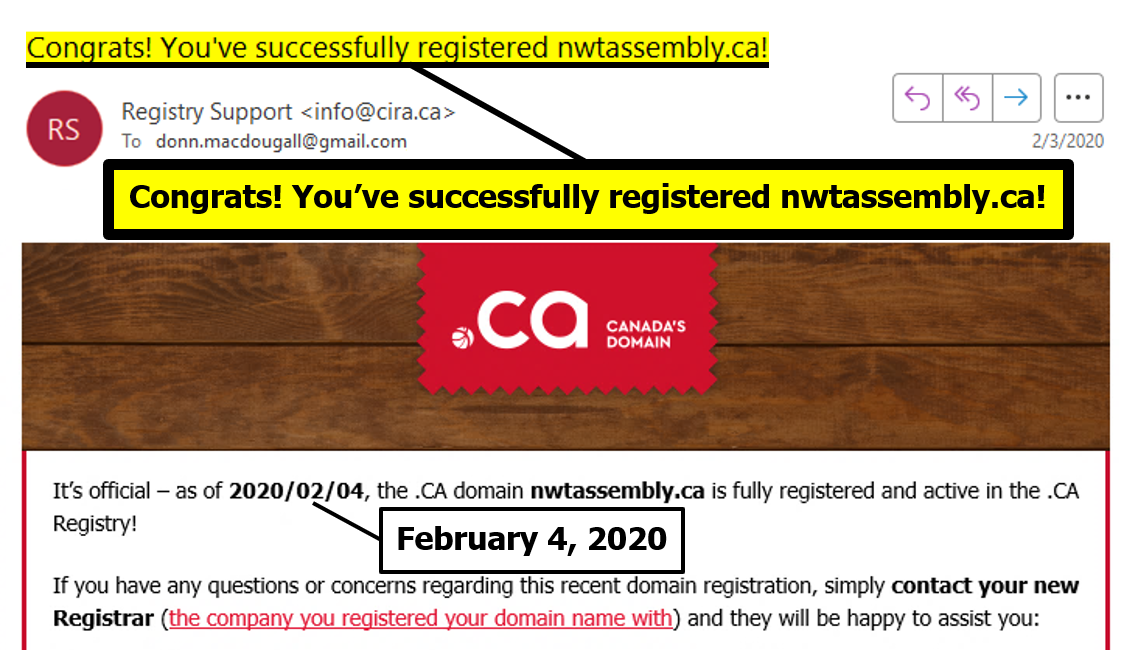 "the NTLA owns the domain name www.ntassembly.ca" is FALSE: