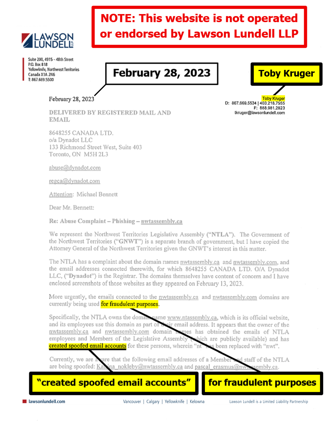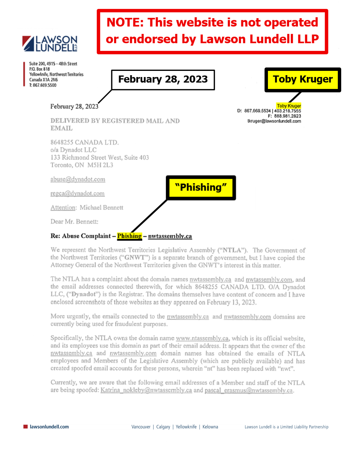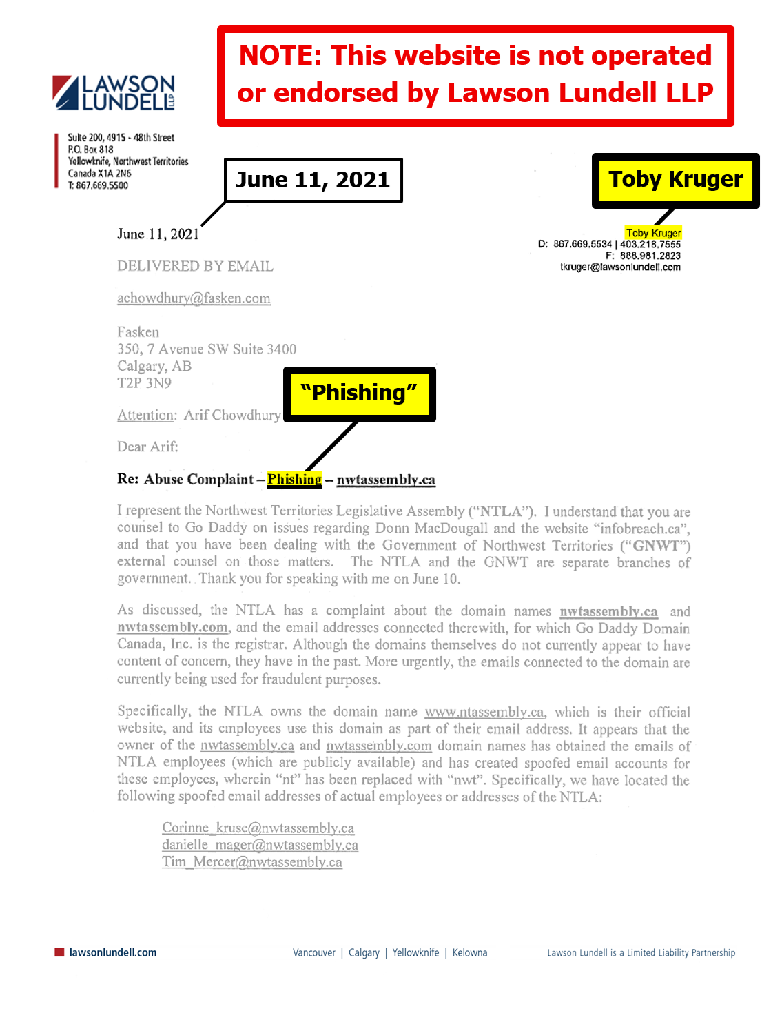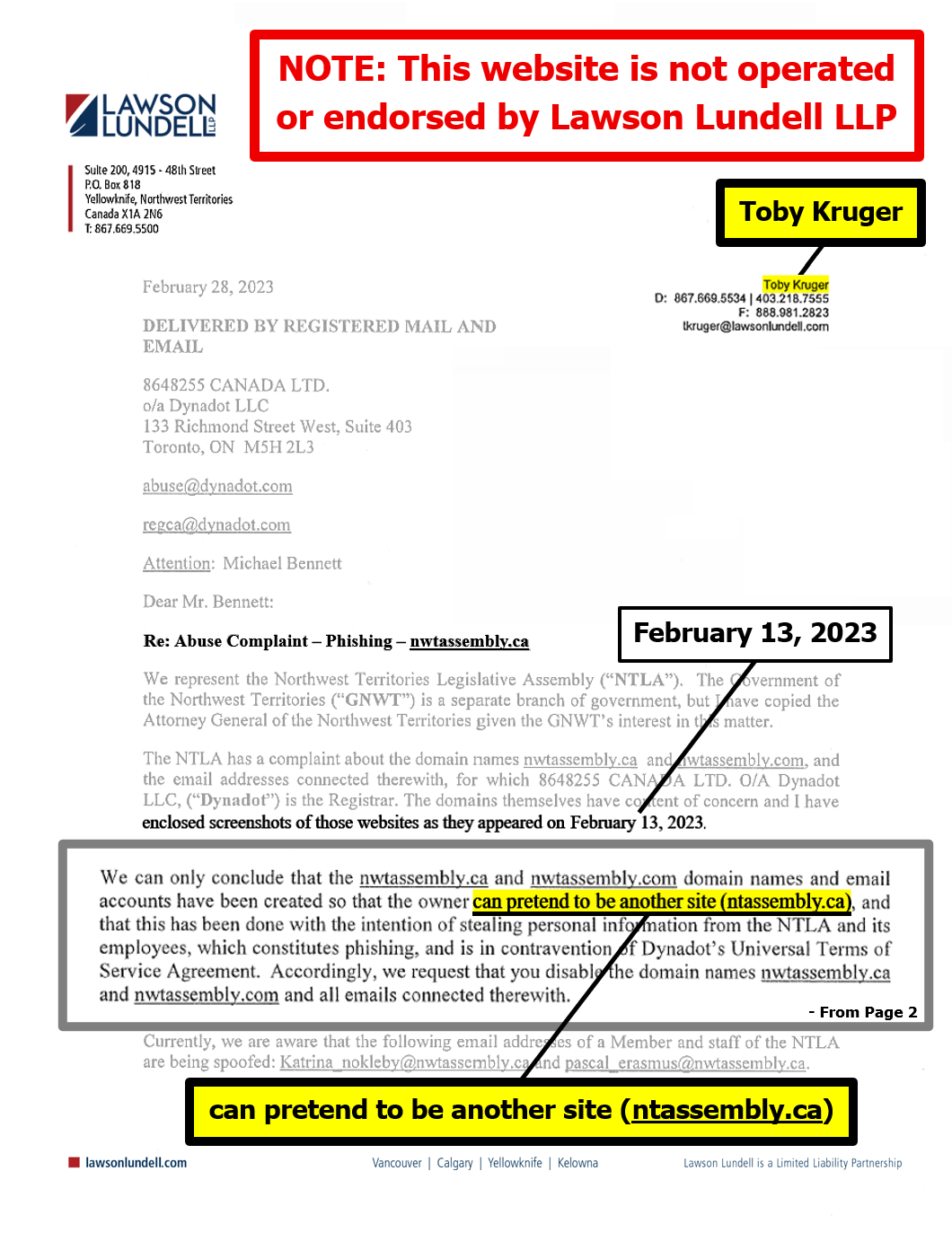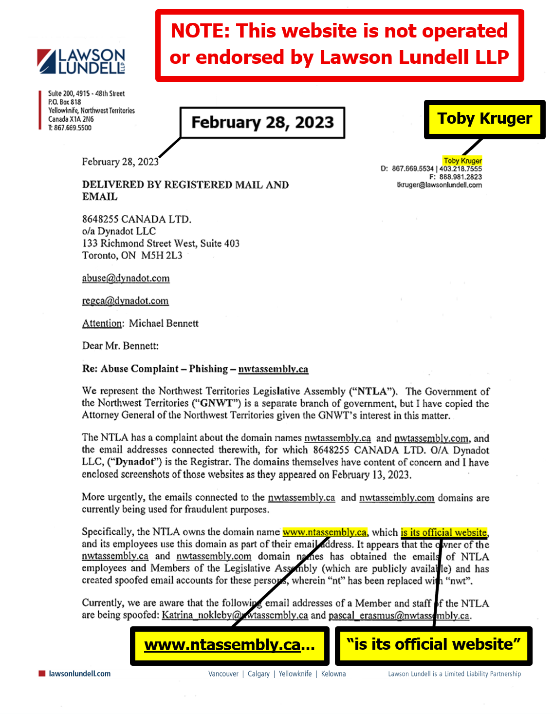 "the NTLA owns the domain name www.ntassembly.ca" is FALSE: