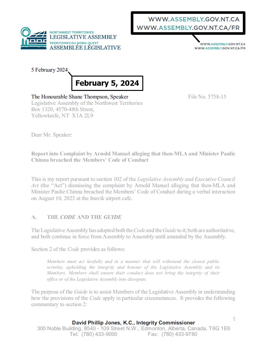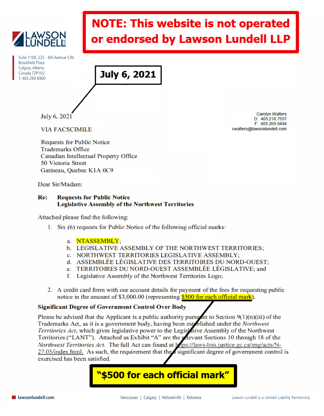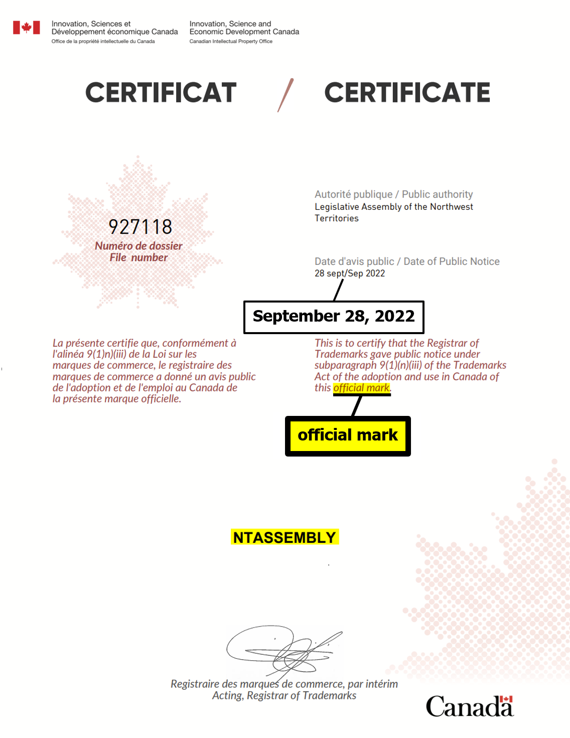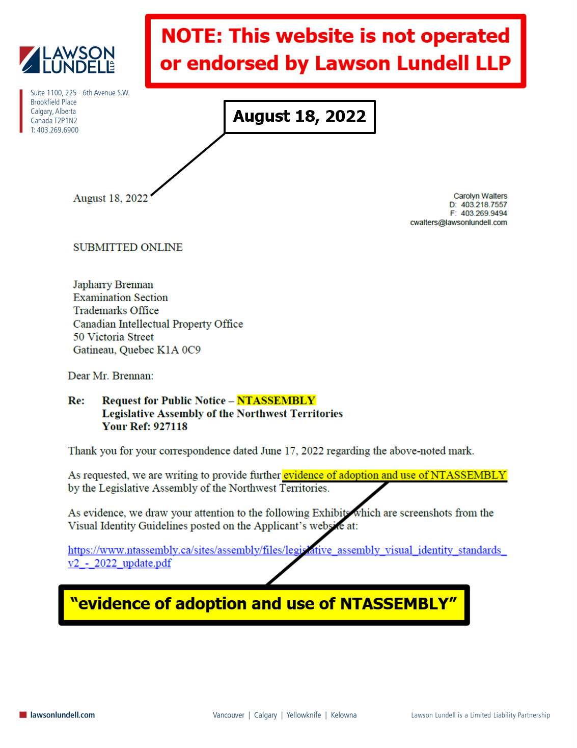 "the NTLA owns the domain name www.ntassembly.ca" is FALSE: