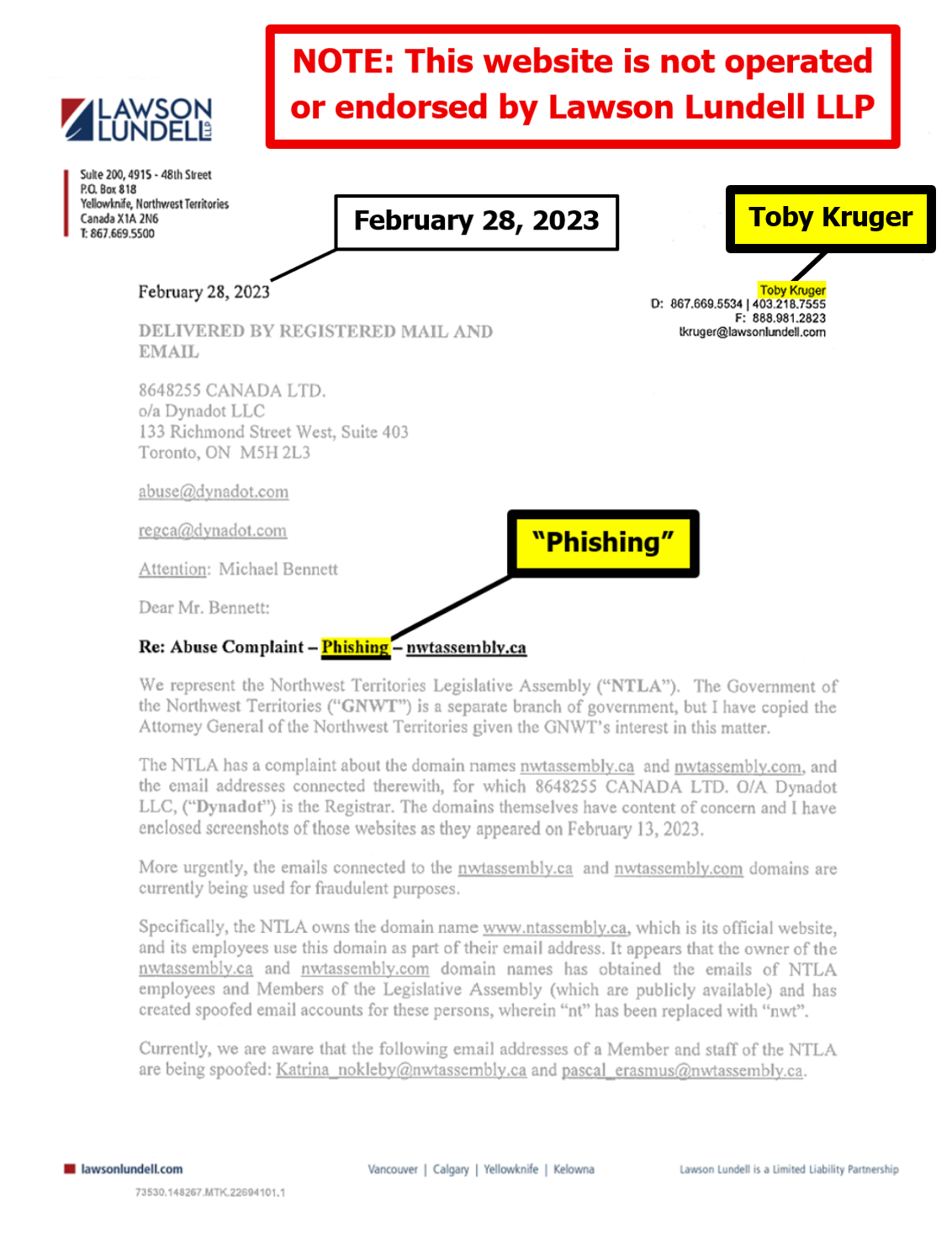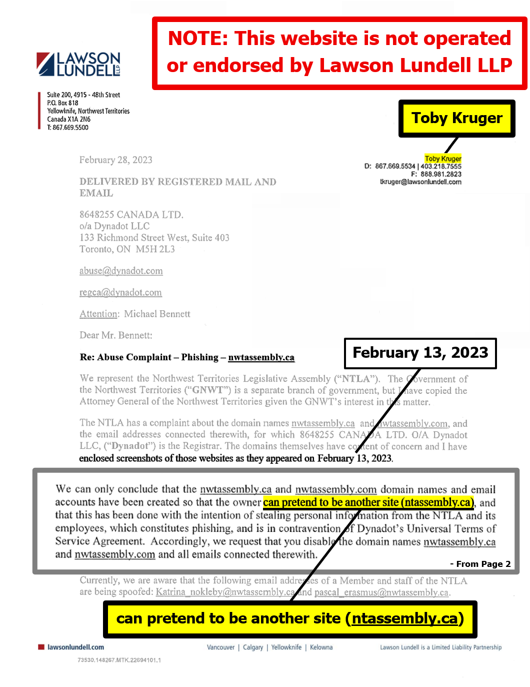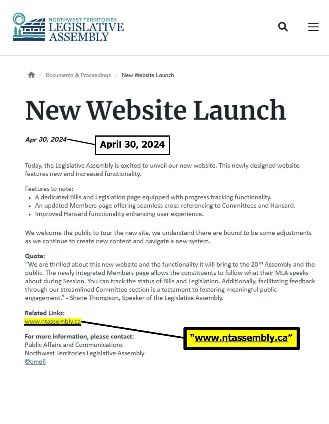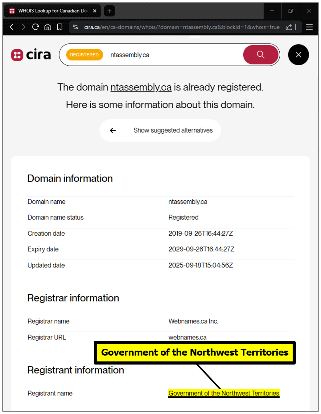 "the NTLA owns the domain name www.ntassembly.ca" is FALSE:
